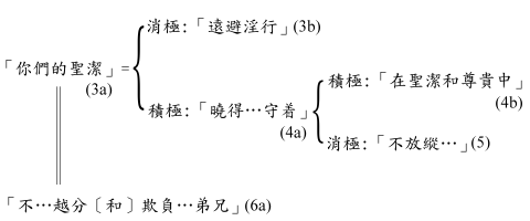 这里用的是跟三章十三节不同的名词“圣洁”,这字41在新约共用了十次:两次指圣灵把人分别出来使之归于基督的行动(帖后二13;彼前一12),其余八次都是指“成圣”的过程或其果效(本节、4节、7节;罗六19、22;林前一30;提前二15;来十二14)。这就是说,信徒除了藉圣灵的工作(帖后二13;彼前一2;参罗十五16)、因信(帖后二13)、在基督里(林前一2)在地位上成为圣洁(林前六11)之后,必须进而经历在实际的生活行为上“成为圣洁”的过程。“你们的圣洁”可解为“你们(被神使你们)成为圣洁”,或“你们叫自己成为圣洁”,鉴于下文的重点是在信徒当做的事,后者较适合本段的文意;不过我们要同时强调,保罗绝对不认为信徒可以靠自己的力量成为圣洁,因此,“使自己成圣”的重点只是在信徒本身有责任,需要采取主动去使自己成为圣洁,却绝不等于“靠自己成圣”;42事实上,在信徒采取主动的背后先有神的主动(腓二13),他们在“使自己成圣”的过程中,必须倚赖神的工作(帖前五23)以及圣灵的引导和能力(加五16、18、25b;罗八13、14)。“成为圣洁”本身的意思非常广泛(参三13“圣洁”一词的注释),不过在本段,它的意思显然是和“淫行”、“私欲的邪情”及“污秽”(3b、5、7节)相对,因此其重点是较狭窄地局限于“清洁”之意。保罗在下文(3-6节在原文是一句)以四个不限定格的词引介的话阐释“成为圣洁”所涉及的内容。43