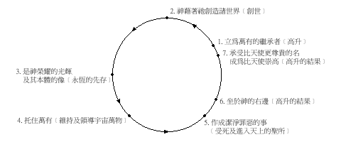 如上文指出,这分段列举了“儿子”的身分和工作七方面的事实,藉此描写祂的独特和尊贵,从而衬托出藉祂而来的启示是不能超越的。以下依次逐点讨论(参本段〔一1-4〕引言注2之图表)。