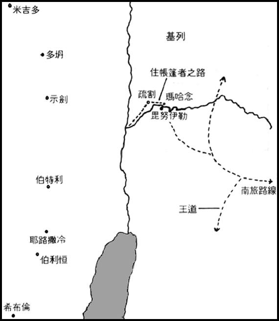 按照故事所说,玛哈念得名乃是在这次上帝显现之后,雅各给的。但是当我们回想,在创世记中,把地名归之于族长所定的是多么惯常,我们还是假定这名字是因异象才惹起注意的为好。玛哈念位在约但以东,士师记八章十一节,所称为‘住帐棚人的路’的疏割平原东边的商队之路,它的支流雅博河之北(参看下图)。这名字原来可能是‘两营’或‘双帐’的意思,是闪语文法称为‘双数’的形式。