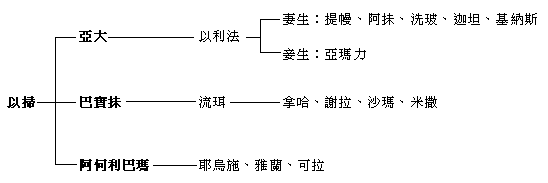以扫众子的名字如下 以扫有三个妻子,五个儿子和十个孙子(有关数字问题,请参看五3~5的注释)记在本段。为方便明了起见,特表列如下(与代上一35~37稍有不同):
