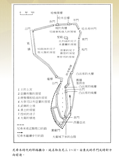 1. 这名册是以反时针方向进行,从羊门开始与退出(参32节),它位于靠近城墙东北角之处。这羊门就在毕士大池旁(约五2),而毕士大池的位置已被考古学家清楚确定。