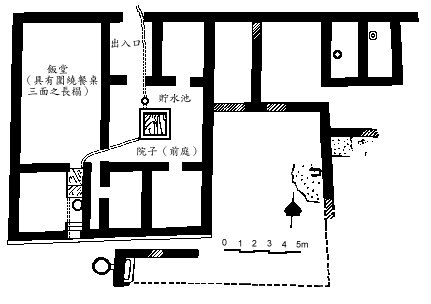 图3:哥林多 Anaploga 一所典型的住宅,若家庭教会在这样的住宅聚会,就会用饭堂及庭院。Murphy-O'Connor 从面积来看,若有五十人在这住宅集会,“已极端不舒服了”(SPC, p.158)。因此,家庭教会必然是小型的。我们无法明白“全教会”聚集时(十四23)在什么地方。若哥林多有几个家庭教会,就很容易形成小集团的了。