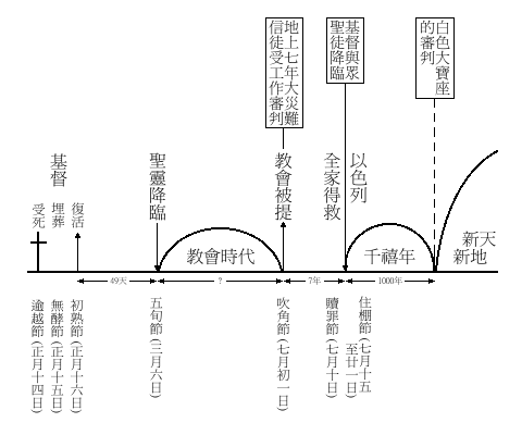 安息日的新约预表意义毫不含糊,但节期的预表却不清楚。不少学者认为本章节期预表神国度计划年表的进程,司可福是代表性的看法,将本章的节期分为七个,逐一注明神国度历史的时间,23马有藻按这个观念列成图表:24