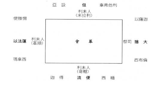 兰塞二世(主前十三世纪)领导之下的埃及大军,亦采用这种阵式安营。他们的营盘成正方形排列,王营位于中央。65同样,以色列的王也是住在祂军队中央的会幕里。此外,各支派随着安营的旗号(2节),也是古代雕刻里的军事器械之一。66至于以色列各支派的纛是什么模样,可惜我们一无所知。这纛(deḡel,2~3、10、18、25、31、34节)是指围绕着该纛安营的群体。在此译作「军旅」更佳。67