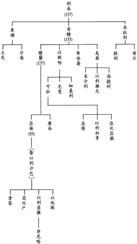 为使读者明了这谱系的修订者如何高抬亚伦起见,特将他所列出的利未的谱系表列于下(括弧内的数字表明该人在生的年岁):