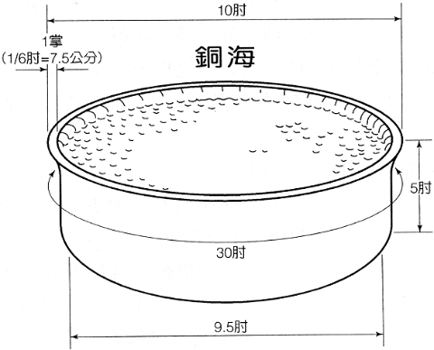 十个样式相同的盆座(REB译为“滑车”)承载由铜海取水注入的水盆,四肘见方(