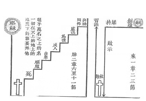 历代的先知圣贤,都是为真理作工,为生命说话,为天路的指导者,竟究不是真理,生命,天路的本身。但耶稣说:我就是道路,真理,生命。我们试想那真的来了,那些陪衬者,尚有什么价值呢?所以在这里,我们要注意这个‘子’字,一切旧约的礼法,道理,预言,史事……都不过是为这个‘子’而有的,兹列图表如下: