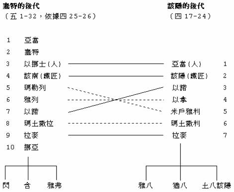 (一)祭典是记述亚当的后代,特别是蓄意要承接前面四25~26之人类在塞特和以挪士里面,重新得到建立的观念;游典却记述该隐的后代是越来越残暴败坏,濒临毁灭边缘的境地。